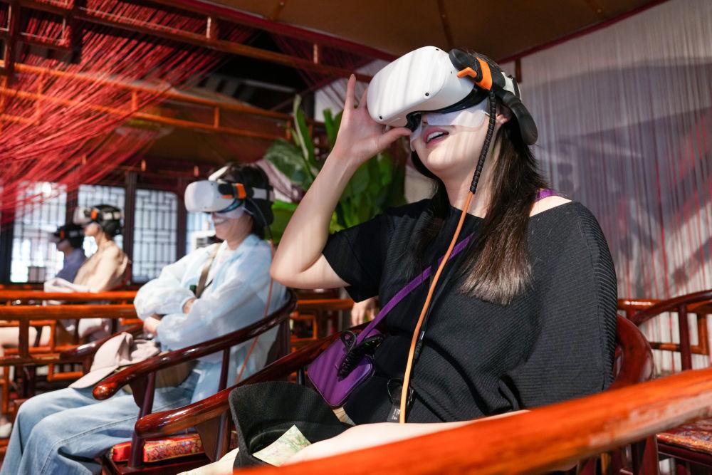 2025年5月18日,游客在江蘇蘇州拙政園體驗(yàn)VR漫游。近年來,蘇州不斷推進(jìn)“數(shù)字園林”建設(shè),在園林整體數(shù)字建模、園林要素?cái)?shù)據(jù)庫建設(shè)、園林“元宇宙”應(yīng)用場景開發(fā)等方面進(jìn)行探索,加快推動(dòng)“數(shù)字園林”成果全民共享。