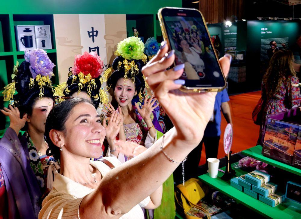 2025年4月30日,以“中國風(fēng)·中國潮”為主題的“遇鑒中國”2025中華文化主題展亮相當(dāng)天開幕的法國巴黎博覽會(huì)。這是參觀者與唐代仕女妝造的中方參展人員在巴黎博覽會(huì)上合影。