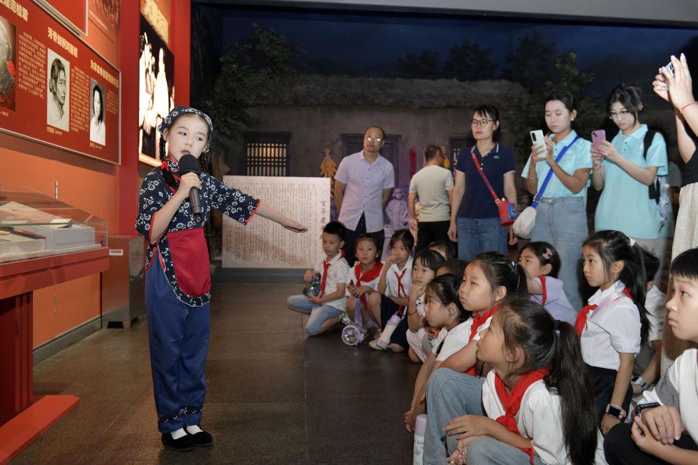 2025年8月7日,在山東沂蒙革命紀(jì)念館,臨沂市沂蒙紅孩子文藝先鋒隊(duì)的房沫昕在講述紅色故事《沂蒙紅嫂祖秀蓮》。沂蒙紅孩子文藝先鋒隊(duì)以“傳承沂蒙精神”為宗旨,通過歌舞、朗誦、故事講述、舞臺(tái)劇等紅色主題文藝節(jié)目,以深情表演弘揚(yáng)主旋律,增強(qiáng)紅色文化感染力,為紅色基因代代相傳注入新生力量。