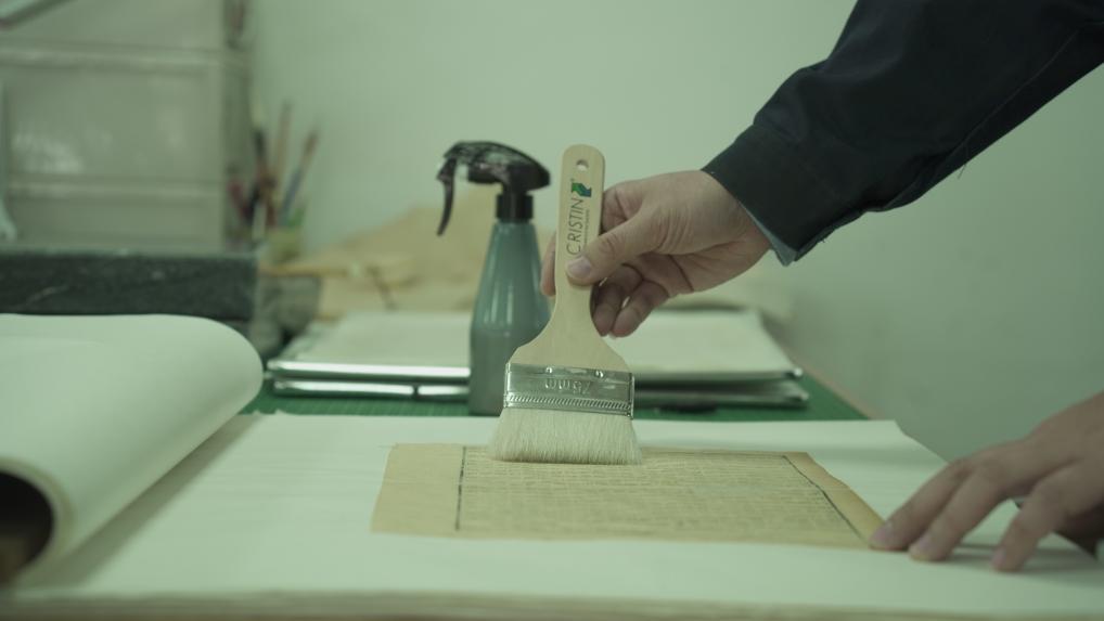 古籍修復(fù)師王泓杰正在修書。他用羊毫筆蘸少許小麥淀粉漿糊,微微浸潤蟲蛀洞口邊緣,隨后取紙覆蓋,手指摁緊,用鑷子將多余部分撕除。他的動作輕快準(zhǔn)確,手指來回間,一個(gè)洞很快補(bǔ)好。