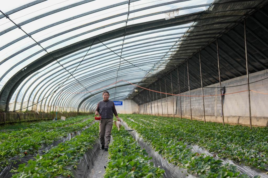 在青海省西寧市湟中區(qū),農(nóng)戶正在采摘草莓。新華社記者張子琪 攝