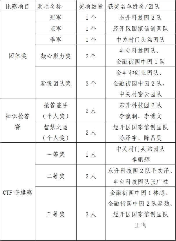 經(jīng)過(guò)多輪激烈角逐,最終決出了“智慧之星”“搶答能手”“CTF奪旗賽”個(gè)人獎(jiǎng),以及“凝心聚力獎(jiǎng)”“新銳團(tuán)隊(duì)獎(jiǎng)”和團(tuán)體冠亞季軍等10余個(gè)獎(jiǎng)項(xiàng)。比賽結(jié)果公布如下,恭喜這些獲獎(jiǎng)隊(duì)伍。