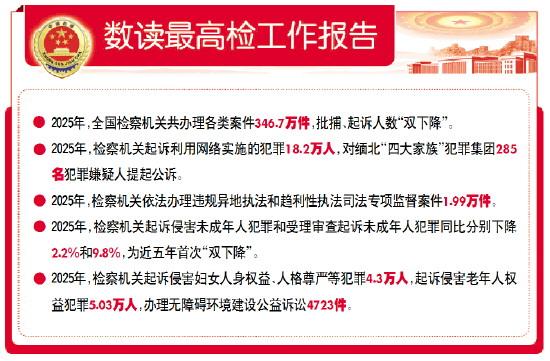 【報(bào)告摘要】2025年,全國檢察機(jī)關(guān)共辦理各類案件346.7萬件,其中最高檢辦理8151件。全年批準(zhǔn)逮捕各類犯罪嫌疑人66.4萬人,提起公訴140.4萬人,同比分別下降11.7%和13.9%。