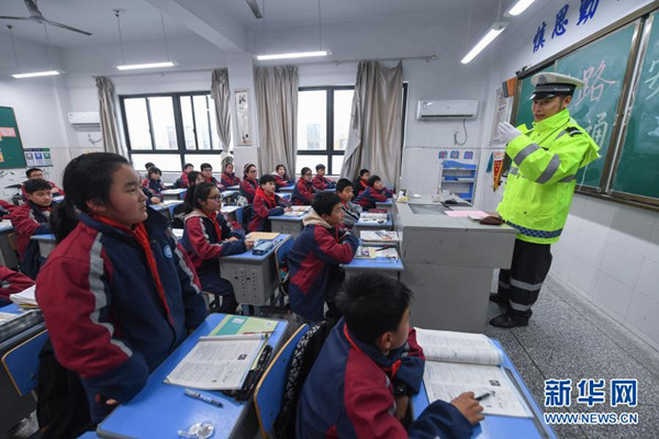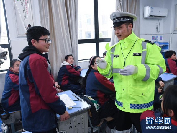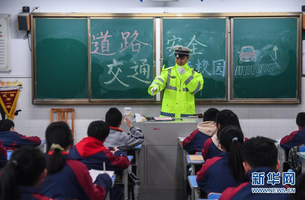 3月16日,湖州市交警支隊東林中隊的輔警給東林中學(xué)的學(xué)生上交通安全課。新華社記者 徐昱 攝