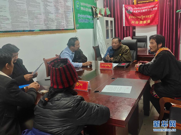 在青海省果洛藏族自治州瑪沁縣大武鄉(xiāng)江前村,糾紛調(diào)解工作組在調(diào)解牧民草場(chǎng)租賃問(wèn)題(4月10日攝)。