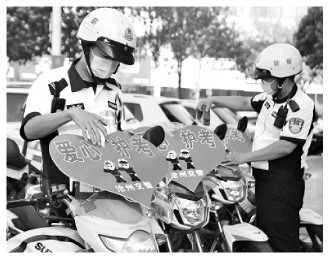 高考在即,河北省滄州市交警提前部署高考護考管控措施,為接送考生車輛“護航”。圖為滄州市公安交警支隊二大隊鐵騎交警為警用摩托車粘貼“愛心護考”標識牌。