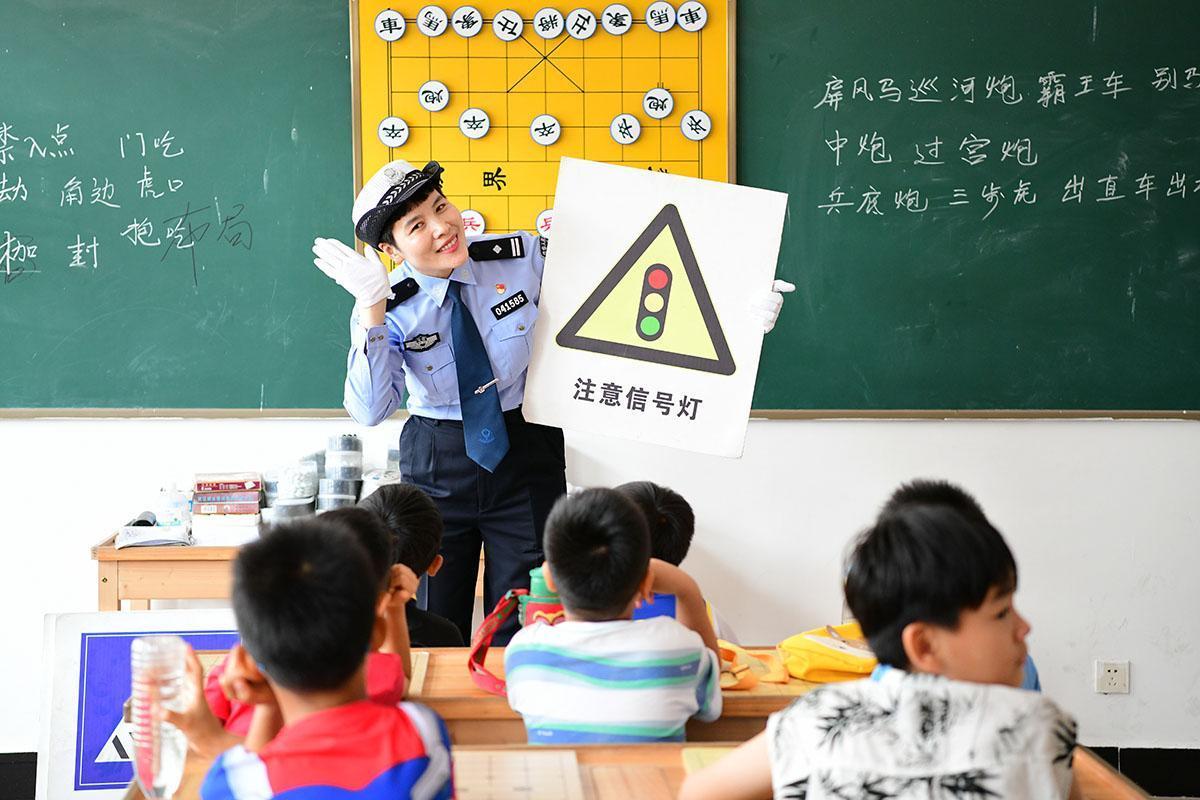 7月17日,安徽省阜南縣公安局交管大隊民警在少年活動中心為暑期興趣班學生講解出行安全知識,增強學生出行安全意識。圖為民警向學生介紹交通標識。