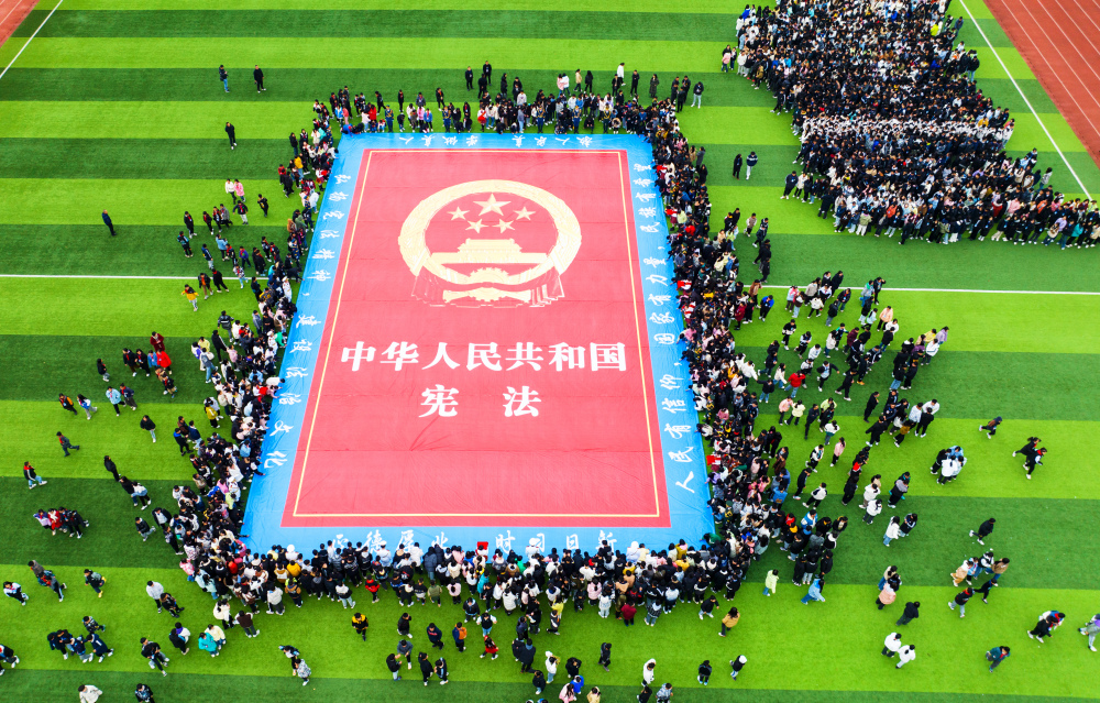 12月4日,重慶市云陽(yáng)縣人民法院聯(lián)合南溪中學(xué)青少年法治教育基地等單位共同舉辦“知憲法于心,守法律于行”活動(dòng),3200多名在校師生參加憲法宣誓儀式。圖為法院干警與千名師生簇?fù)響椃ê灻?nbsp;