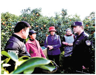 圖為韓濤(右一)生前在柑橘銷售時(shí)節(jié)向農(nóng)戶開展安全宣傳。 秭歸縣公安局供圖