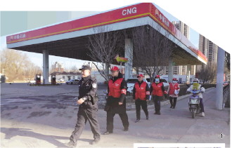 圖① 孔笛帶領平安志愿者在轄區(qū)巡邏。