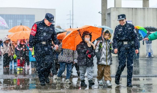 12月18日,安徽省馬鞍山市和縣公安局護(hù)學(xué)崗民警雪中護(hù)送學(xué)生放學(xué)。 本報(bào)通訊員 秦祖泉 攝