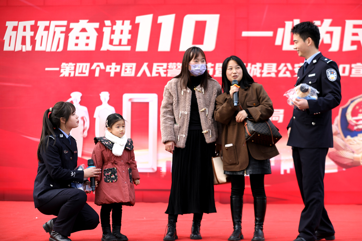 1月9日,安徽省舒城縣公安局在轄區(qū)市民廣場舉辦“砥礪奮進110,一心為民保平安”匯演活動。民警通過警用裝備展示、反電詐情景劇表演、問答互動等形式,慶祝第四個中國人民警察節(jié)暨全國第38個“110宣傳日”。圖為民警與市民互動答題。