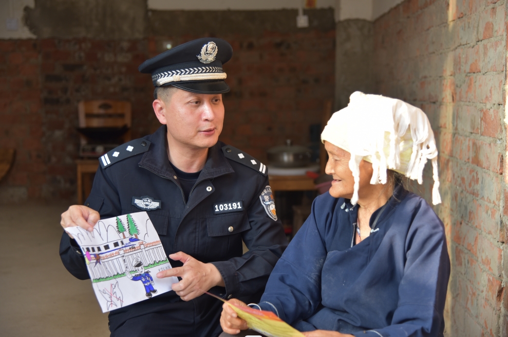 近日,南寧鐵路公安局北海公安處五象南站派出所民警進(jìn)村入戶,通過(guò)一幅幅自繪水彩畫(huà),向村民宣傳鐵路安全與防詐反詐等知識(shí)。圖為民警向群眾宣傳鐵路安全知識(shí)。 本報(bào)通訊員 廖才立 攝
