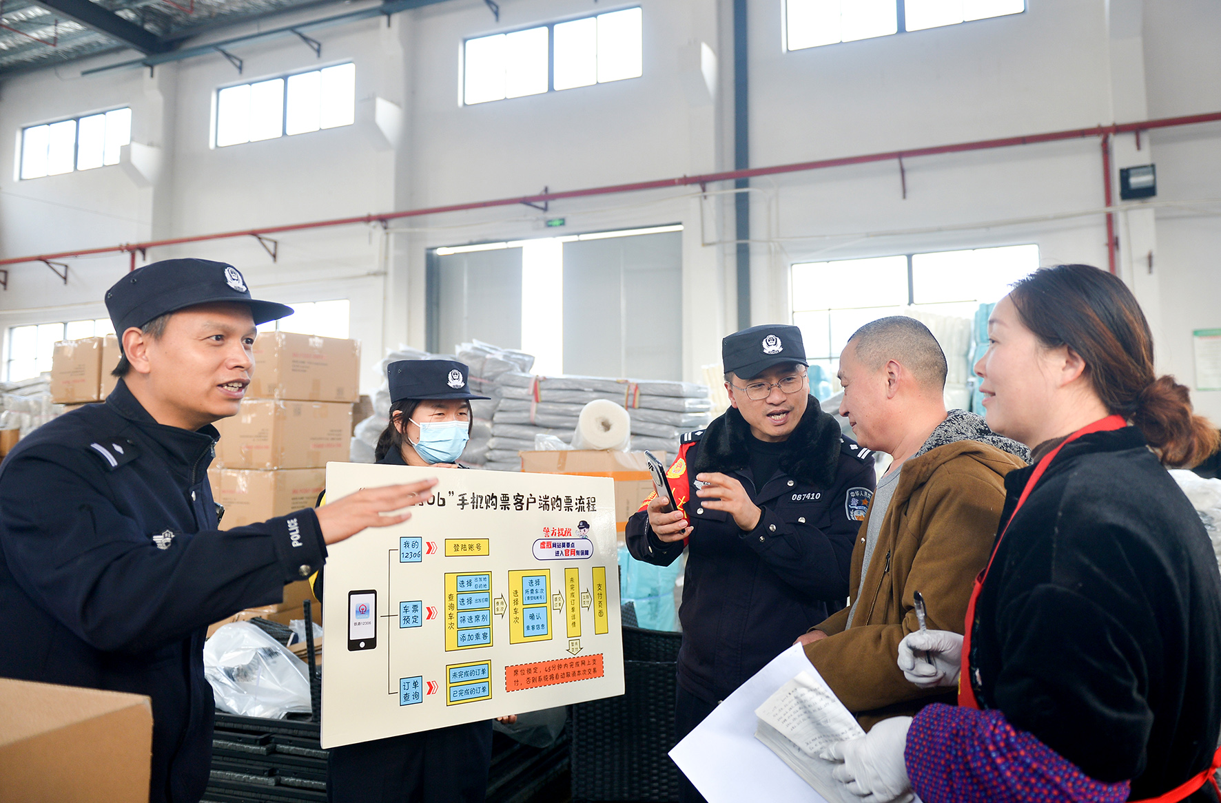 1月15日,杭州鐵路公安處臺(tái)州站派出所民警在企業(yè)車間,指引務(wù)工人員在鐵路12306官方平臺(tái)購買春運(yùn)期間車票。
