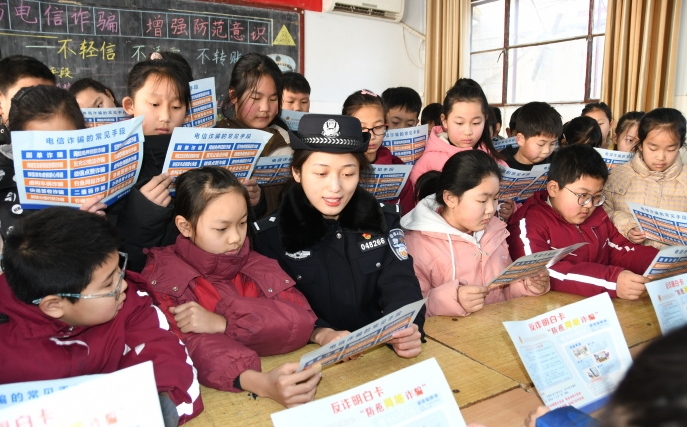 近日,河南省??h公安局衛(wèi)溪派出所組織民警走進中小學(xué)校開設(shè)“平安課堂”,向?qū)W生宣傳講解安全防范知識。圖為民警向?qū)W生發(fā)放《反詐明白卡》,并講解反詐防詐知識。