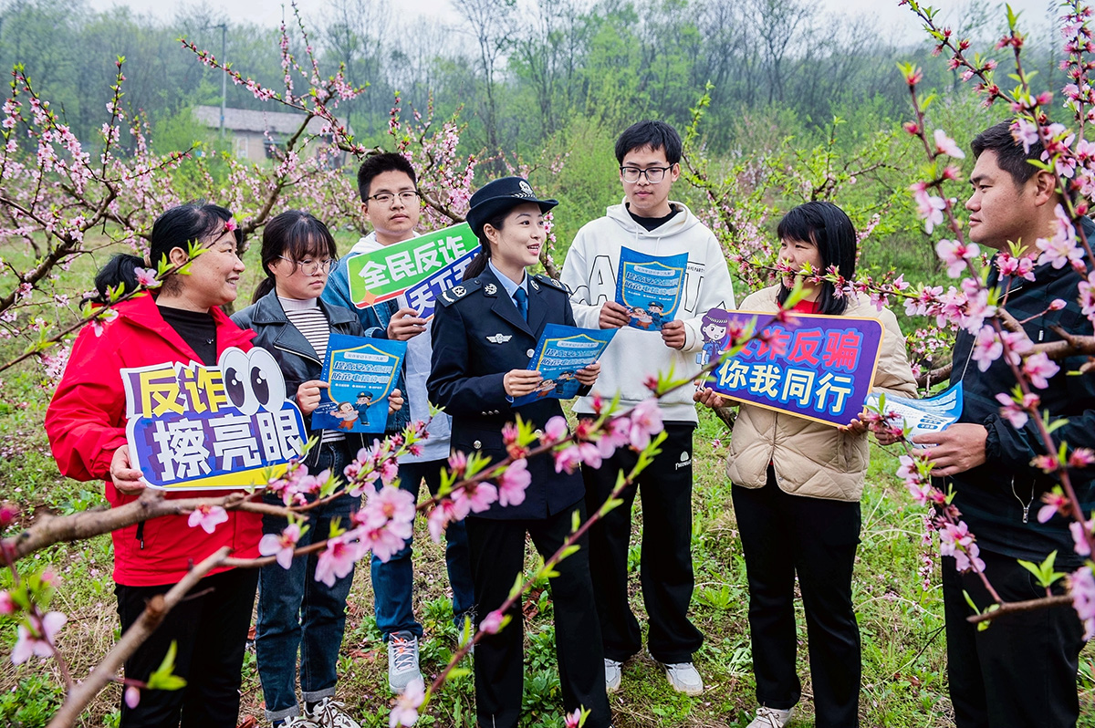 近日,安徽省含山縣司法局普法宣傳小分隊在仙蹤鎮(zhèn)六衖村桃花園向游客開展“游桃園 說反詐”普法宣傳活動。圖為普法工作人員面對面向游客講解反詐知識。