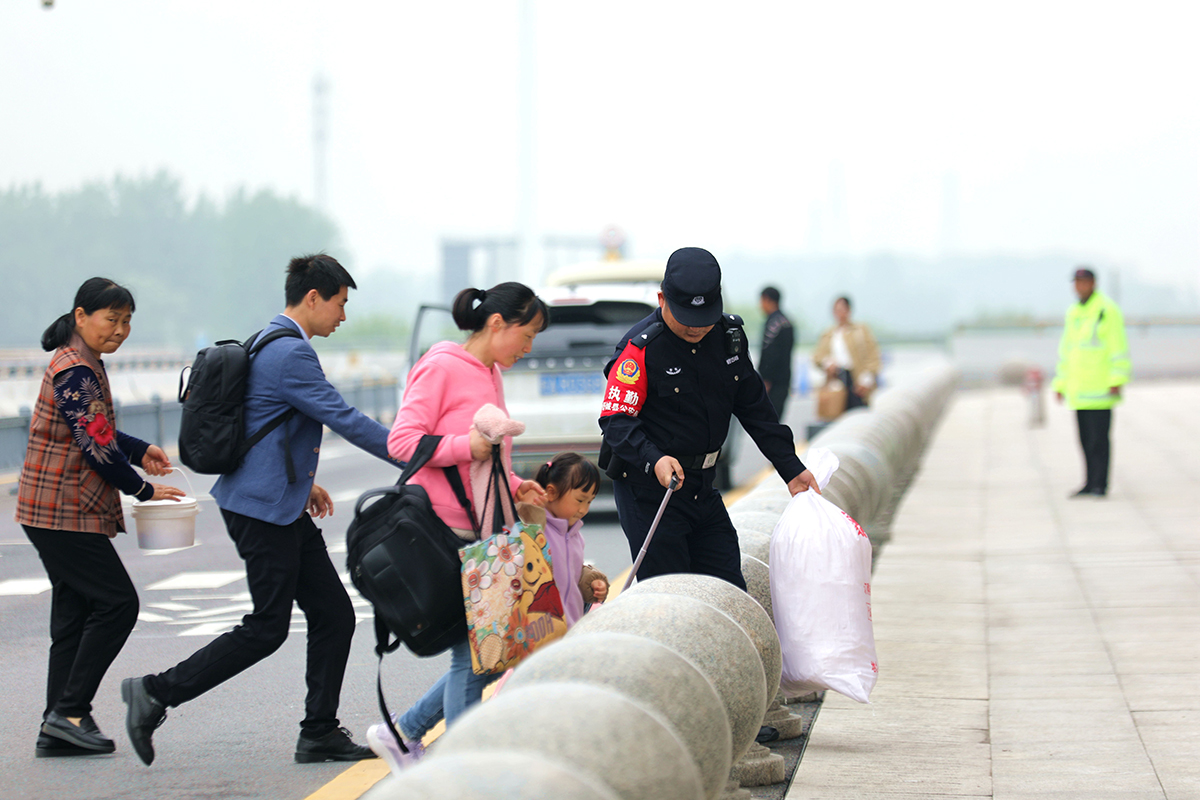 5月5日,安徽省舒城縣公安局千人橋派出所聯(lián)合高鐵東站警務站民警輔警在入站口平臺疏導交通、服務群眾,確保返程旅客平安出行。圖為執(zhí)勤輔警幫助旅客快速通過車輛通道。