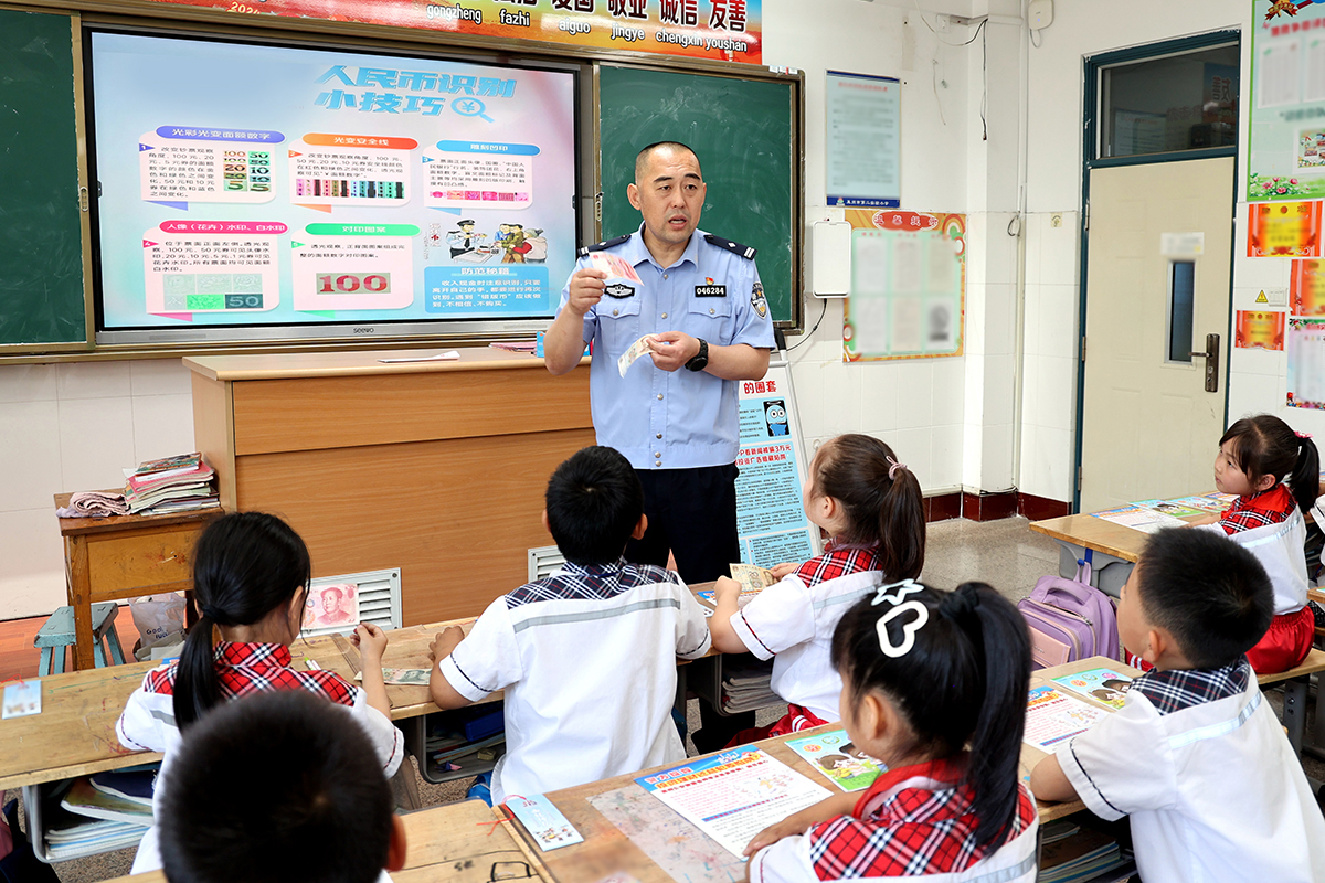 近日,山東省萊州市公安局經(jīng)偵大隊組織民警來到轄區(qū)各小學(xué)校園開展普法教育,進(jìn)一步促進(jìn)學(xué)生樹立遵紀(jì)守法意識,提高安全防范能力。圖為民警為小學(xué)生講解如何識別假幣。