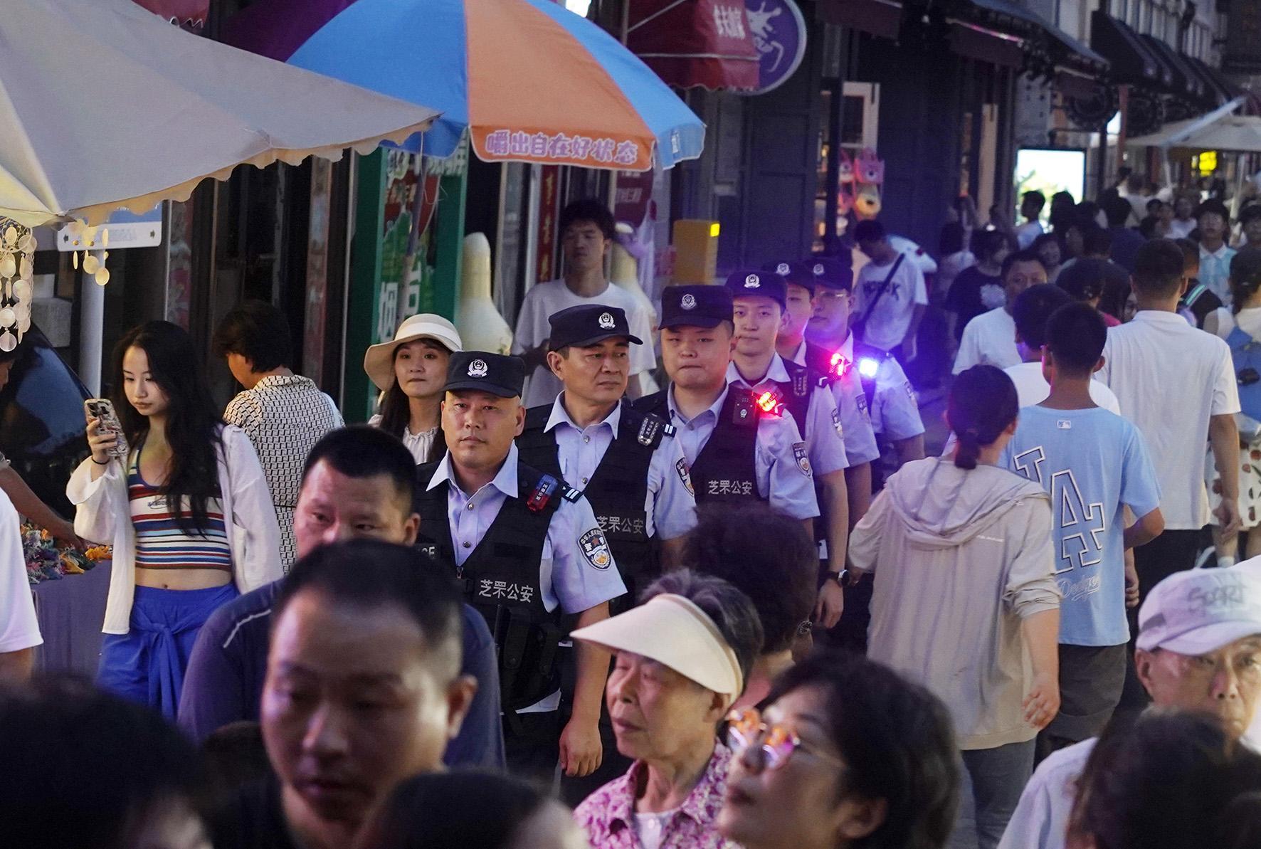 近日,山東省煙臺(tái)市公安局開展夏夜治安巡查宣防第二次集中統(tǒng)一行動(dòng),組織警力加大對(duì)景區(qū)、車站等人員密集區(qū)域的檢查和巡防力度,全力營(yíng)造安全穩(wěn)定的社會(huì)治安環(huán)境。圖為煙臺(tái)市公安局芝罘分局民警在朝陽(yáng)街景區(qū)巡邏。