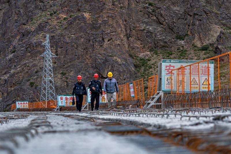 近日,新疆出入境邊防檢查總站克州邊境管理支隊(duì)托云邊境派出所民警走進(jìn)轄區(qū)一在建道路施工項(xiàng)目工地開展安全生產(chǎn)檢查,宣講法律知識,做好安全提醒,保障工程早日竣工。圖為民警在施工現(xiàn)場排查風(fēng)險(xiǎn)隱患。