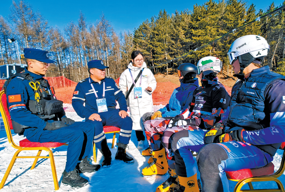 12月1日,2024—2025賽季國(guó)際雪聯(lián)單板滑雪平行大回轉(zhuǎn)世界杯比賽在內(nèi)蒙古自治區(qū)喀喇沁旗開(kāi)賽,為確保比賽順利進(jìn)行,喀喇沁旗公安局全力保障賽場(chǎng)內(nèi)外安全穩(wěn)定。圖為11月30日,民警在賽場(chǎng)內(nèi)與參賽運(yùn)動(dòng)員“話安全”。