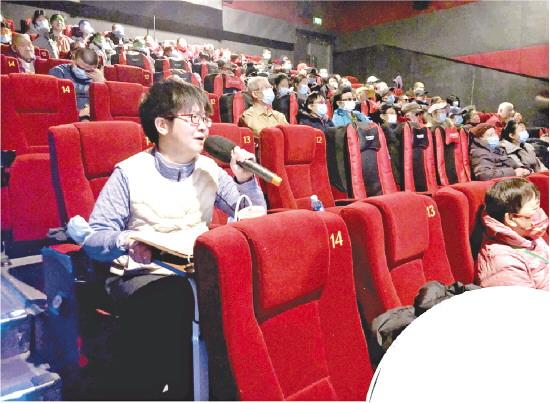 圖為志愿者在心目影院為盲人朋友講電影。 (受訪者供圖)