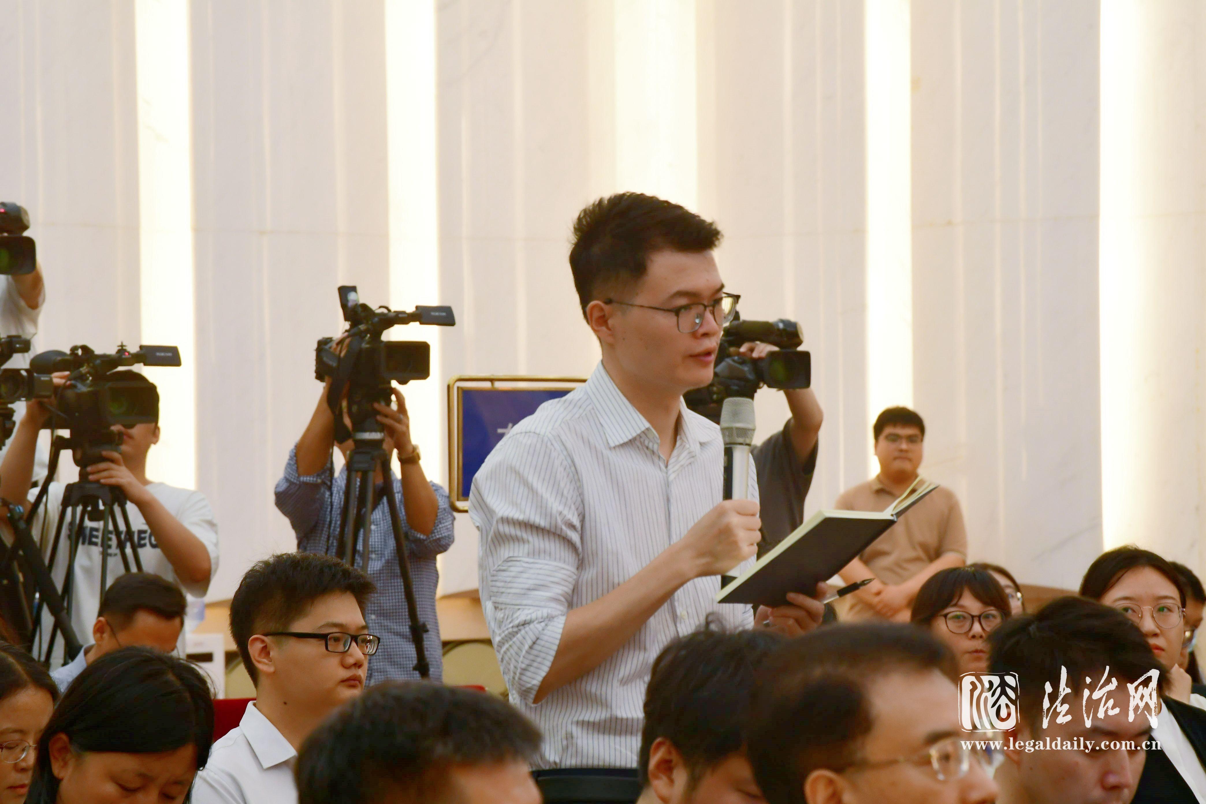 9月13日下午,全國(guó)人大常委會(huì)辦公廳舉行新聞發(fā)布會(huì)。圖為人民日?qǐng)?bào)記者提問(wèn)。張峻銘 攝