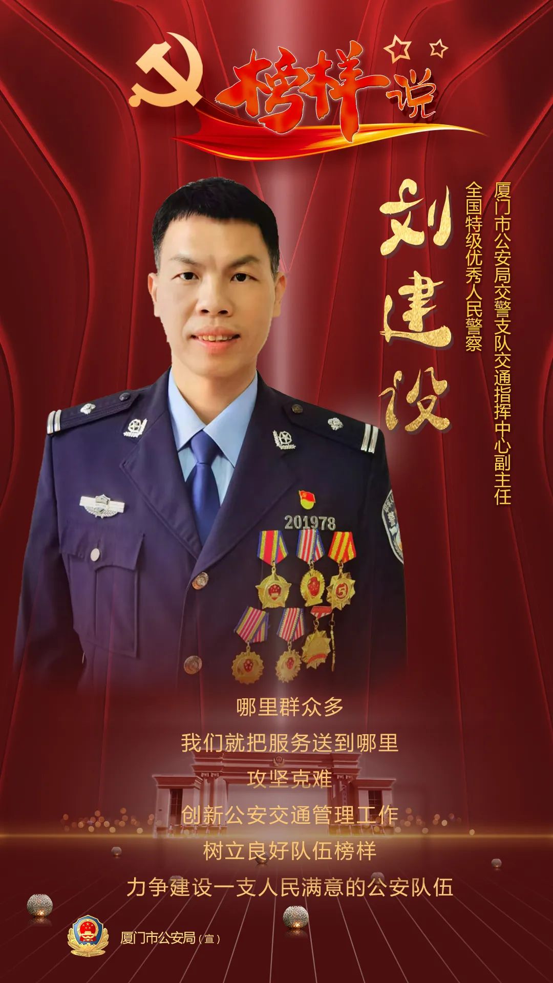 交警劉建設是廈門警隊的“發(fā)明家”,在他手里誕生的多個全國和全省首創(chuàng)的交通科技管理系統(tǒng),讓廈門的路網(wǎng)越來越“聰明”,交通管理科技民生舉措,使廈門市民能夠輕松享受到智能交通帶來的便利。2019年12月,劉建設從交通指揮中心調(diào)任交通科研設施大隊,從“臺前”轉(zhuǎn)到了“幕后”,又創(chuàng)造了多個服務基層實戰(zhàn)的創(chuàng)新項目,福建省總工會還為他創(chuàng)建了“劉建設勞模工作室”。