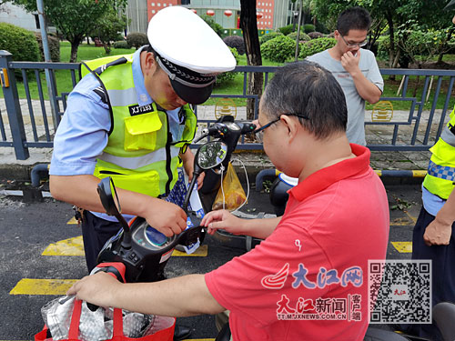 “同志,請把這張?zhí)嵝褬?biāo)簽貼在你電動自行車的前面,時刻提醒你戴上頭盔。”7月5日,南昌市紅谷灘區(qū)鳳凰南大道上,紅谷灘交警大隊(duì)二中隊(duì)民警李黎正在勸導(dǎo)騎電動自行車的市民佩戴頭盔。除了對未佩戴頭盔的車主進(jìn)行警示教育外,他還在每輛電動自行車顯眼位置貼上提醒標(biāo)簽。