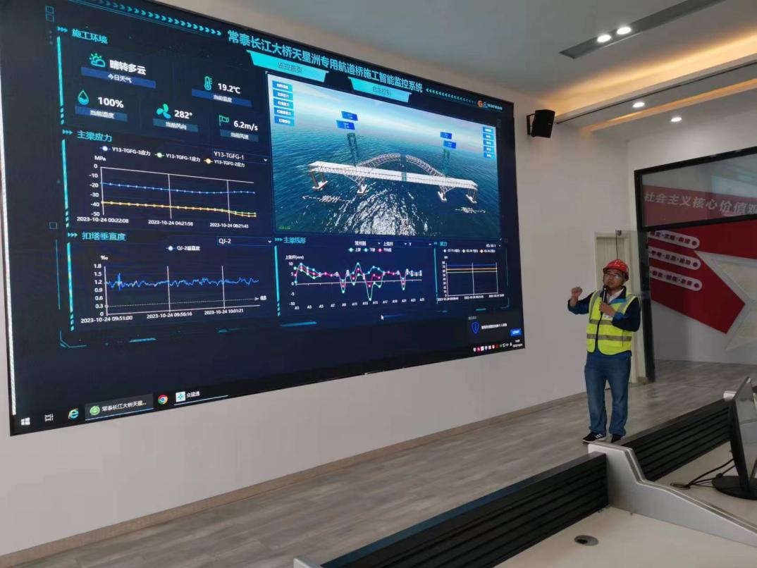 數(shù)字孿生系統(tǒng),不僅方便了解施工現(xiàn)狀,而且能進(jìn)行仿真推演,優(yōu)化施工方案。在天星洲專用航道橋施工過程中,利用數(shù)字孿生技術(shù),搭建云端無線采集系統(tǒng),全方位實(shí)時獲取橋梁施工相關(guān)數(shù)據(jù)。讓數(shù)據(jù)“在電腦上多跑路”,對施工控制數(shù)據(jù)進(jìn)行實(shí)時分析,實(shí)時預(yù)警,確保結(jié)構(gòu)施工過程始終處于可控狀態(tài);以不同顏色區(qū)分當(dāng)前桿件安裝狀態(tài),實(shí)現(xiàn)工序級別的形象進(jìn)度展示及基于工序的質(zhì)量驗(yàn)收;而且平臺內(nèi)可以對施工工序模擬,保障現(xiàn)場構(gòu)件保供安排,確保施工質(zhì)量、物資調(diào)度、進(jìn)度安排合理可控……