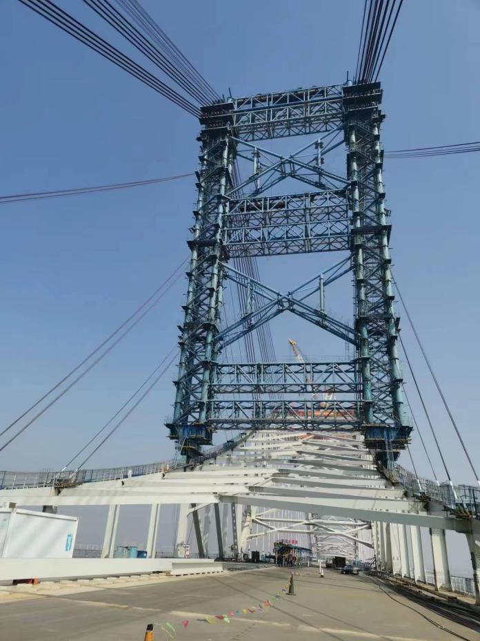 登上懸于江面60米的大橋在建主航道橋面,一排排“N”形鋼桁梁呈現(xiàn)在記者眼前。據(jù)介紹,鋼桁梁制造完成后將運(yùn)至橋位處整體吊裝,吊裝時需要將鋼桁梁平穩(wěn)提升到江面以上60米,最大吊裝重量超過1700噸。為滿足橋梁建設(shè)模塊大型化發(fā)展的新需求,項(xiàng)目團(tuán)隊(duì)研制了2000噸級全球最大噸位橋面吊機(jī),用于主航道橋鋼桁梁架設(shè)?!霸摰鯔C(jī)集成了可視化吊裝系統(tǒng)、智能調(diào)位及快速定位系統(tǒng)、自動倒換軌道及行走控制系統(tǒng)、輔助掛索等功能于一體,是橋面吊機(jī)制造史上一次重要突破?!蓖踺x介紹說,該吊機(jī)最大起重量為2000噸,最大起升高度80米,吊幅為13到23米之間,相當(dāng)于能一次性將1400臺小汽車吊至25層樓的高度。