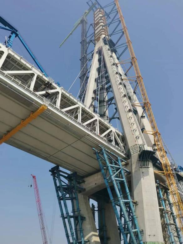 在位于江心的施工現(xiàn)場,記者看到,一臺比主塔還高的“綠巨人”在空中“忙碌”,它是項(xiàng)目團(tuán)隊(duì)自主研發(fā)的全球首臺萬噸米級智能化塔吊。巨大的身軀卻有著靈活的“大腦”,集成了主動防碰撞、鋼絲繩磨損檢測、監(jiān)測與預(yù)警系統(tǒng)和變頻回轉(zhuǎn)技術(shù)等,并應(yīng)用北斗定位技術(shù),實(shí)現(xiàn)鋼塔節(jié)段吊裝對接過程智能指引,確保吊裝過程安全高效。據(jù)王輝介紹,大橋主塔是整個橋梁的核心工程,其中最搶眼的中、下塔柱首創(chuàng)采用了空間鉆石型混凝土索塔,施工過程中,項(xiàng)目團(tuán)隊(duì)自主研發(fā)了鋼筋部品裝配化施工技術(shù),研發(fā)使用新型液壓智能爬模等等,大幅減少塔上鋼筋作業(yè)時間,顯著提高了塔柱施工效率。相對于傳統(tǒng)索塔施工工藝,節(jié)省工期70%,高空作業(yè)人員減少60%。