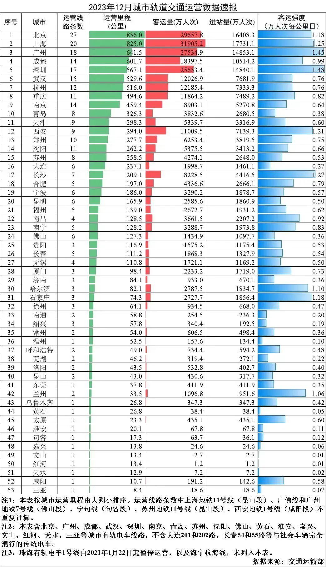 2023年12月,31個?。ㄗ灾螀^(qū)、直轄市)和新疆生產(chǎn)建設(shè)兵團(tuán)共有55個城市開通運(yùn)營城市軌道交通線路306條,運(yùn)營里程10165.7公里,實(shí)際開行列車333萬列次,完成客運(yùn)量26.7億人次,進(jìn)站量16億人次。12月份,客運(yùn)量環(huán)比增加0.8億人次,增長3.2%,同比增加15.1億人次,增長130.1%,較2019年月均客運(yùn)量增加6.8億人次,增長34%。12月份全國總運(yùn)營里程的平均客運(yùn)強(qiáng)度為0.863萬人次每公里日,較2019年全國總運(yùn)營里程的平均客運(yùn)強(qiáng)度降低18.6%。