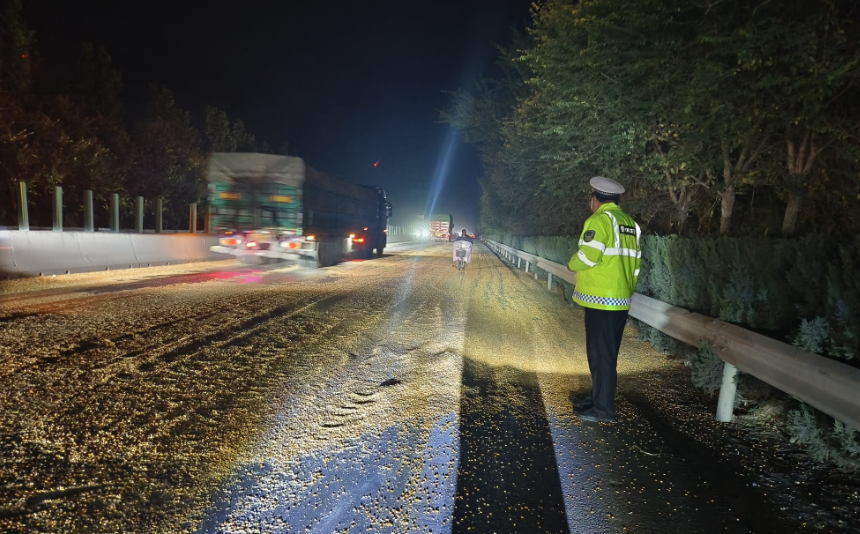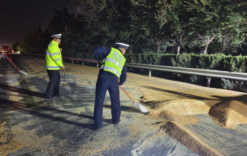 2024年11月4日晚,河南省鶴壁市淇縣交警大隊(duì)高村中隊(duì)況宏民班組在107國道巡邏時(shí),忽然聽到有人呼喊:“不好!誰的玉米灑了。”