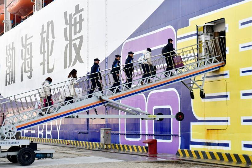 1月21日,在山東港口煙臺港客運(yùn)站,煙臺市港航公安局乘務(wù)警察支隊的乘警一組三人登乘渤海輪渡“中華復(fù)興”輪執(zhí)勤。郭緒雷/攝