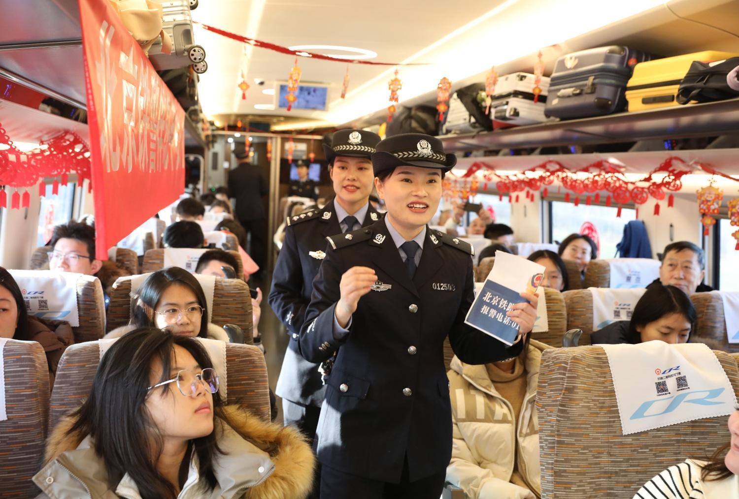 據(jù)北京鐵路公安處乘警支隊副支隊長王廣羽介紹,今年春運期間,除了值乘圖定列車外,乘警支隊還值乘686趟次臨時旅客列車。其間,列車乘警將加大車廂巡視宣傳檢查力度,提升見警率、管事率,全力確保廣大旅客平安出行。針對管內(nèi)重點長途旅客列車和值乘的重點區(qū)段,乘警支隊還組織經(jīng)驗豐富的宣傳小分隊上車添乘,通過加大宣傳聲勢切實提升廣大旅客安全出行防范意識。