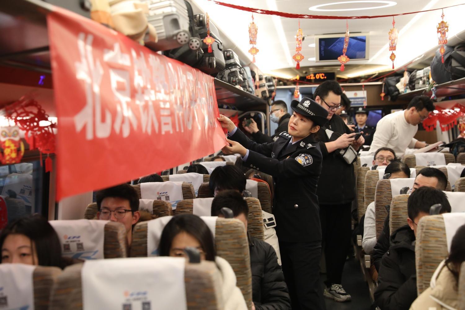 站臺上,由北京西開往哈爾濱西的G935次列車已準備就緒,車廂內(nèi)喜慶的拉花、火紅的窗花,將整個車廂裝點得年味十足。一條“北京鐵警伴您平安出行”的橫幅揭開了此次列車上慶小年的主題。