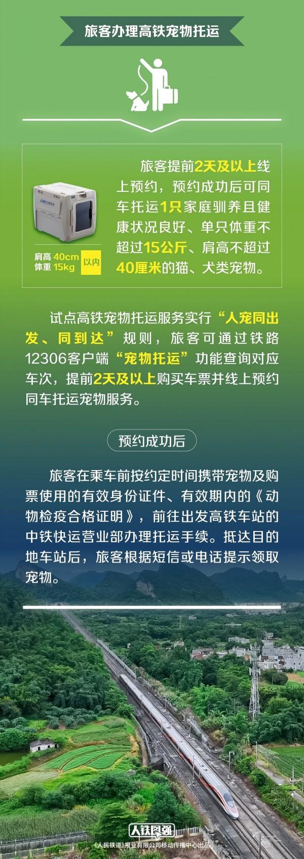4月8日起,鐵路部門在京滬高鐵部分車次試點(diǎn)“隔離運(yùn)輸、人寵分開(kāi)、專人看護(hù)”的高鐵寵物托運(yùn)服務(wù),鐵路12306同步推出“寵物托運(yùn)”功能,旅客提前2天及以上線上預(yù)約,預(yù)約成功后可同車托運(yùn)1只家庭馴養(yǎng)且健康狀況良好、單只體重不超過(guò)15公斤、肩高不超過(guò)40厘米的貓、犬類寵物。