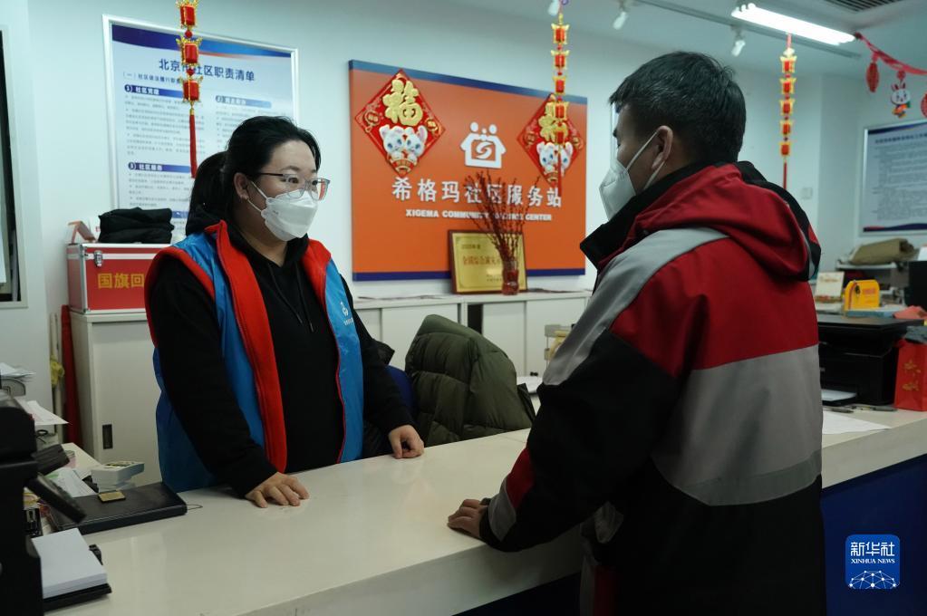 1月16日,在北京市海淀區(qū)中關村街道希格瑪社區(qū)服務站,社區(qū)工作人員(左)與快遞員交流。