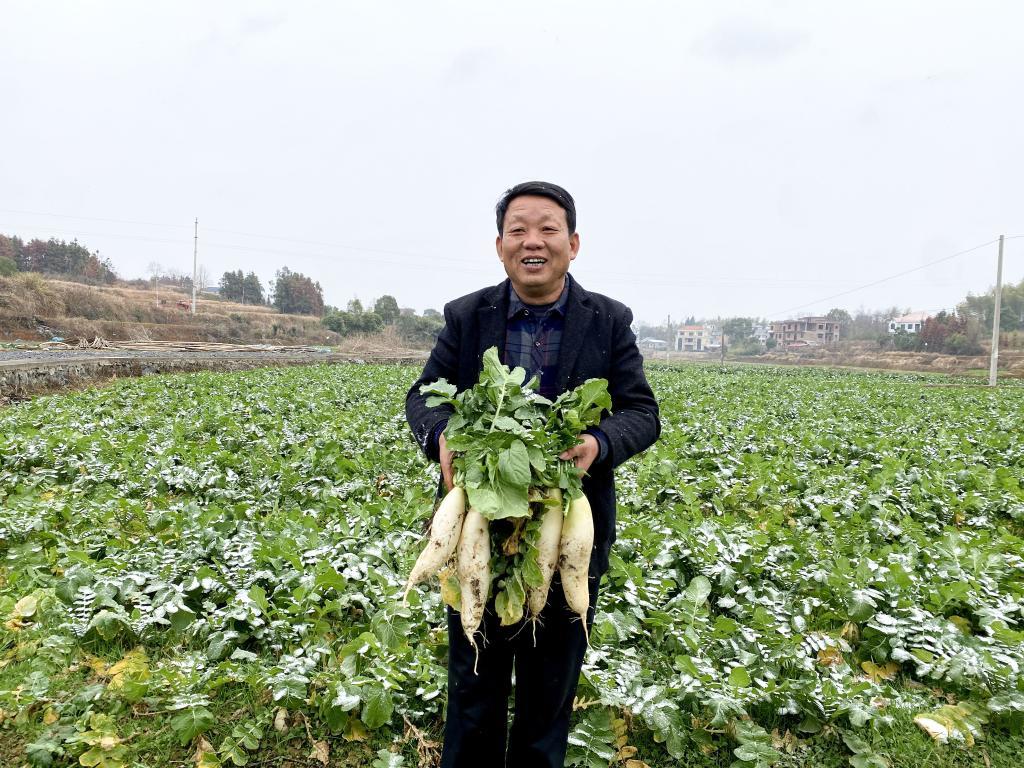 在橋頭河鎮(zhèn)新塘村,陽加軍向記者展示剛拔出的蘿卜。新華社記者柳王敏 攝