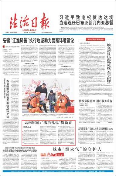 “和順敲開(kāi)福祿門(mén),法治迎來(lái)滿園春”,昭通巧家縣茂租鎮(zhèn)的年貨集市上,普法志愿者們?yōu)橼s集的村民們送上墨香四溢的春聯(lián),同時(shí)還有一份別致的新春“法治禮包”,內(nèi)含法治小故事、消防安全小冊(cè)子、印有法治宣傳標(biāo)語(yǔ)的圍裙等。