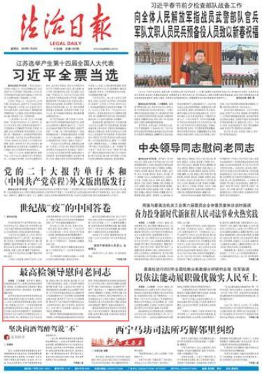 本報訊 記者張昊 春節(jié)前夕,最高人民檢察院黨組書記、檢察長張軍慰問韓杼濱、賈春旺,代表最高檢和全體檢察干警衷心祝愿老領(lǐng)導和家人新春愉快、身體健康、闔家幸福。