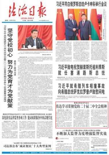 本報北京3月1日訊 記者張晨 3月1日下午,最高人民法院黨組召開會議,傳達(dá)學(xué)習(xí)貫徹黨的二十屆二中全會精神,研究部署貫徹落實(shí)措施。最高人民法院黨組書記、院長周強(qiáng)主持會議并講話,強(qiáng)調(diào)要深入學(xué)習(xí)貫徹習(xí)近平總書記在黨的二十屆二中全會上的重要講話精神,把思想和行動統(tǒng)一到黨中央決策部署上來,牢記“國之大者”,落實(shí)“三個更好統(tǒng)籌”,充分發(fā)揮審判職能作用,以高質(zhì)量司法服務(wù)高質(zhì)量發(fā)展。