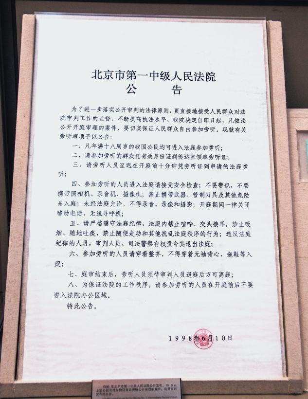 1998年6月,北京市第一中級人民法院公開宣布,18歲以上的公民可持身份證自由旁聽公開審理的案件。圖為當(dāng)時發(fā)布的公告。視覺中國供圖