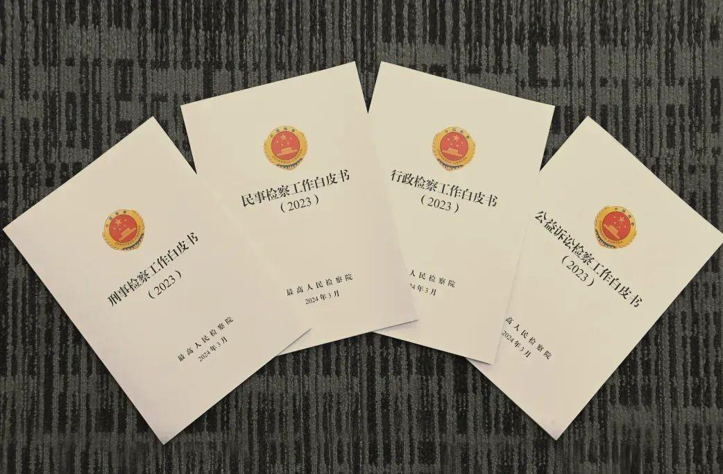 圖為2024年3月9日最高人民檢察院發(fā)布的2023年“四大檢察”工作白皮書(shū)。白皮書(shū)按照刑事、民事、行政、公益訴訟檢察四個(gè)條線,全方位呈現(xiàn)2023年檢察工作新進(jìn)展新成效。最高人民檢察院供圖