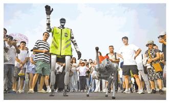 圖為杭州西湖斷橋上,西湖景區(qū)公安AI警隊隊員人形機器人協(xié)同機器狗同步現(xiàn)身。 王剛 攝