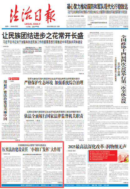今年全國兩會上,多位人大代表、政協(xié)委員接受《法治日報》記者采訪時表示,在述法現(xiàn)場,地方黨政主要負責(zé)人以第一人稱述“我”,向上級“一把手”匯報年度依法履職情況,通過“一把手抓一把手”的“小切口”,發(fā)揮壓實“關(guān)鍵少數(shù)”法治建設(shè)責(zé)任的“大作用”,已成為提升領(lǐng)導(dǎo)干部依法辦事能力的重要手段、推動突出問題解決的重要渠道和公眾參與法治建設(shè)評價的重要途徑。