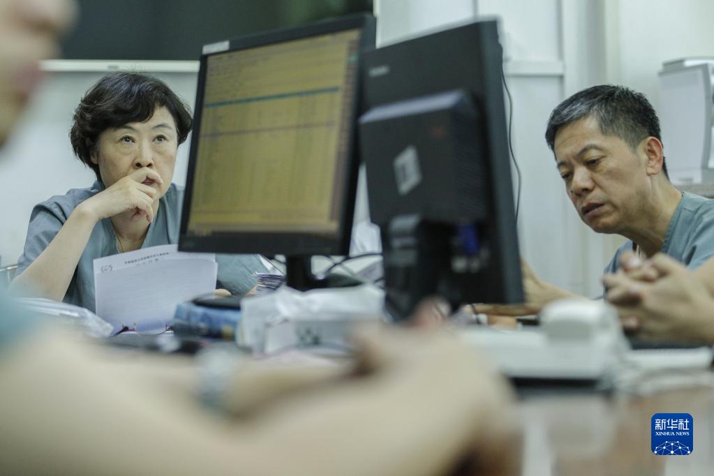 錢素云(左)在辦公室參加病例討論(2019年7月31日攝)。新華社記者 才揚 攝