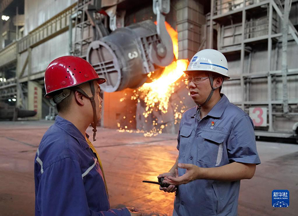 邯寶煉鋼廠特檔技術(shù)主管、轉(zhuǎn)爐車間副主任唐笑宇(右)在轉(zhuǎn)爐車間與工友交流(2022年9月7日攝)。新華社記者 楊世堯 攝