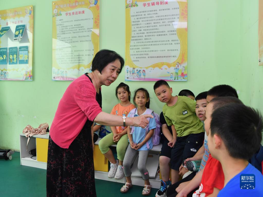 在福建省福州市軍門社區(qū)少兒托管中心,林丹與放學歸來的孩子們交流(2022年9月14日攝)。新華社記者 姜克紅 攝